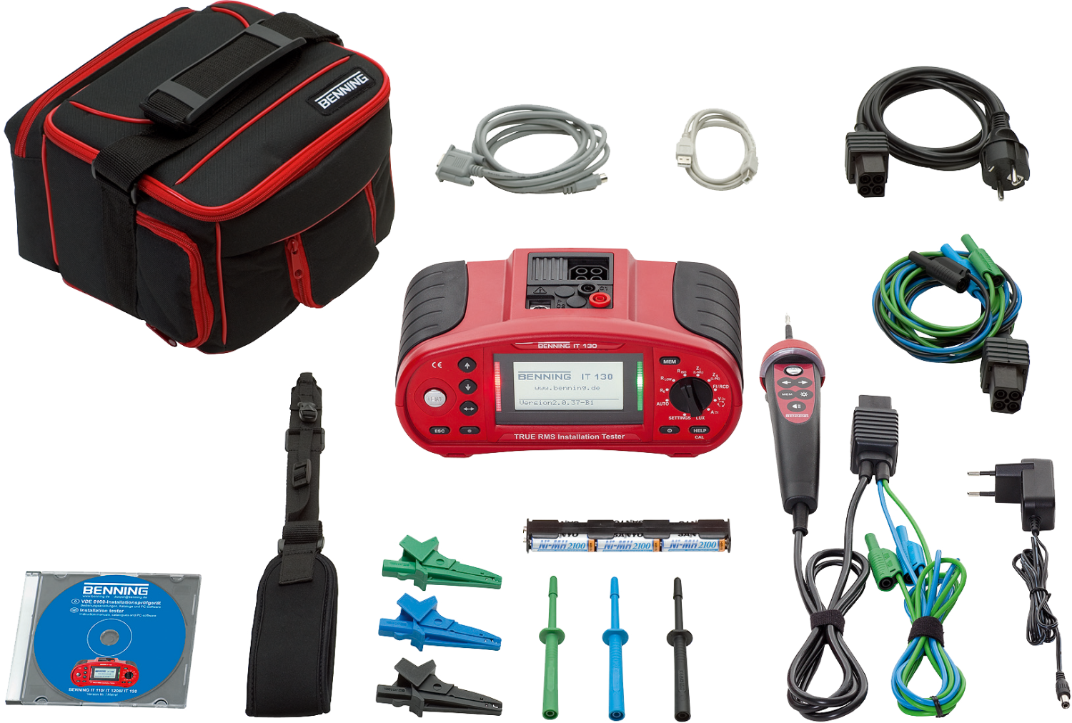 • Inclusief draagtas, draagriem, Commander-testpen, testkabels, krokodillenklemset, interfacekabels, protocolsoftware BENNING PC-WIN IT 130, 6 NiMh-accu's, laadapparaaat, gebruiksaanwijzing (CD) en kalibratiecertificaat