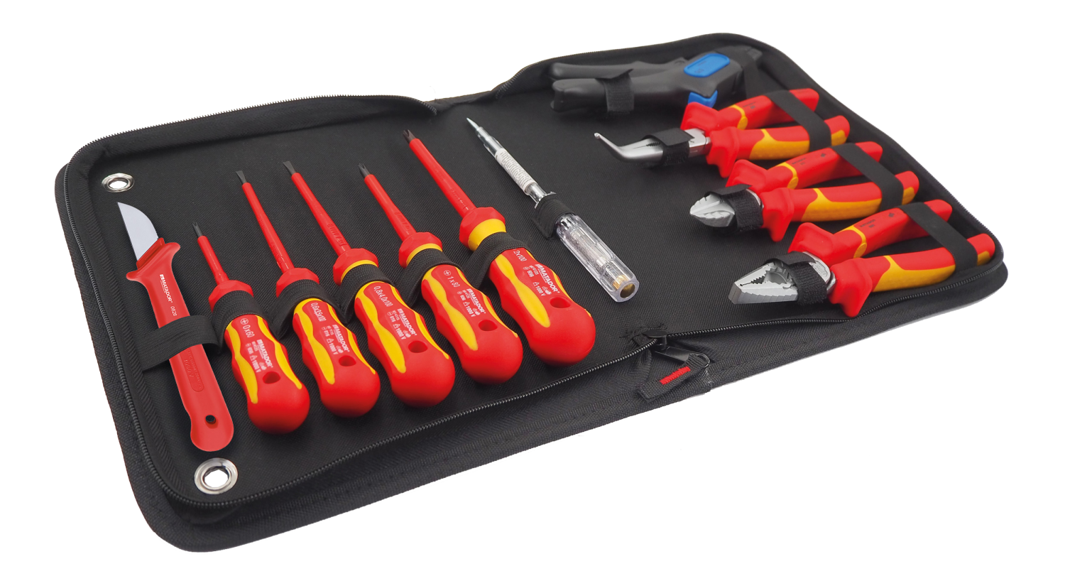 Praktische VDE-gereedschapsset in Nylon tas met de belangrijkste gereedschappen voor elektriciens voor het repareren van elektrische systemen. De ultracompacte VDE-gereedschapsset past bovendien in elk dashboardkastje.