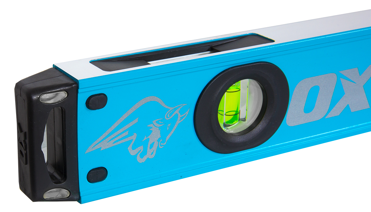 De ongelooflijk sterke OX Pro Waterpas is voorzien van unieke, zeer nauwkeurige, UV-bestendige en vergrote dubbele Easy View libellen. Het sterke aluminium profiel is aan de boven- en onderrand fijn gefreesd voor 100% precisie. Voorzien van gemakkelijk vast te houden siliconen handgrepen met luchtkussens en perfect gepositioneerde rubberen noppen voor krasbescherming bij het drukken tegen een muur en voor extra grip op het oppervlak. Schokbestendige eindkappen beschermen tegen vallen en stoten ter plaatse.