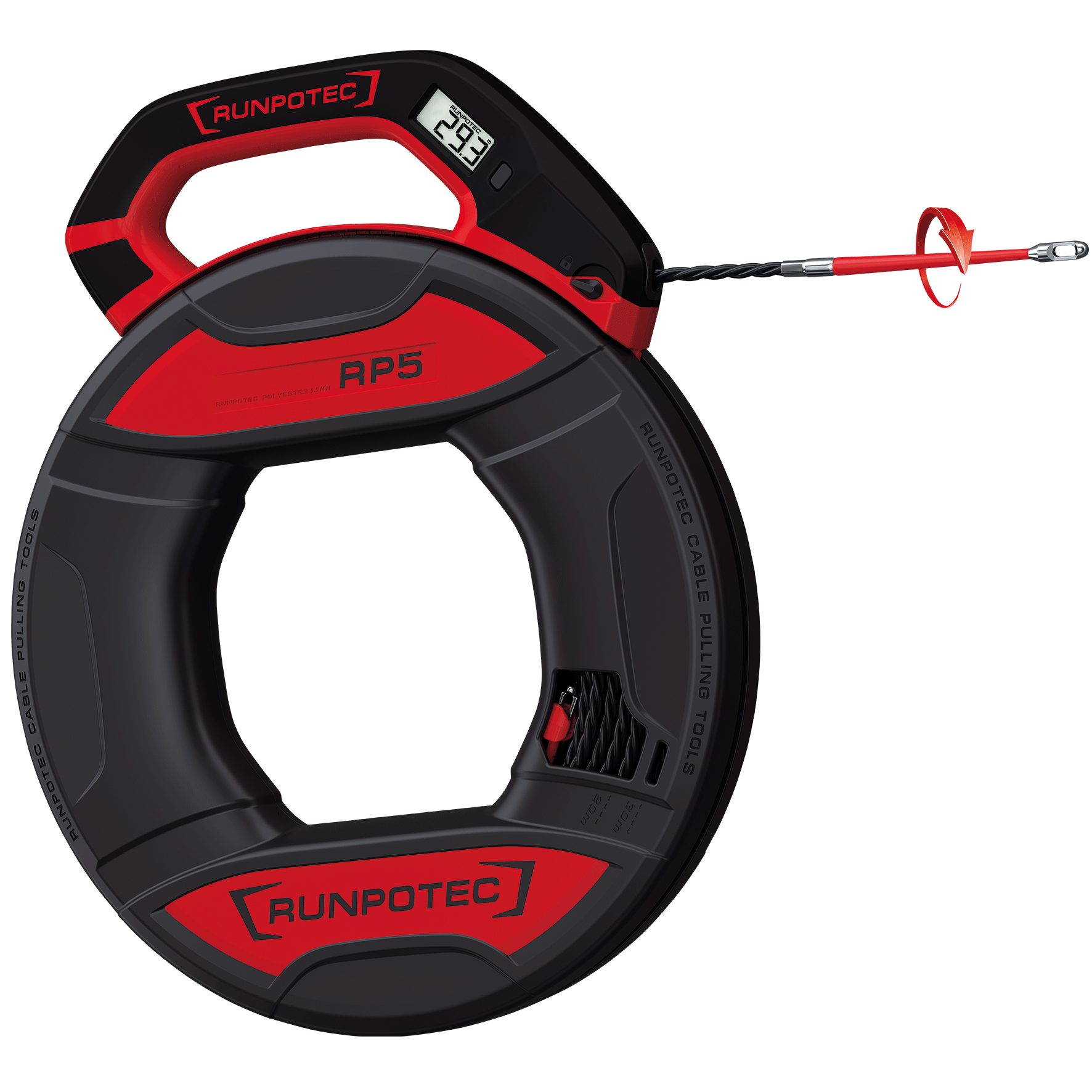 De RP5 - RUNPOTEC Polyester Ø 5,5 mm is een kabeltrekveer inclusief digitale meterteller (voor het bepalen van de lengte van leidingen/kabels of voor het maken van kabellijsten).