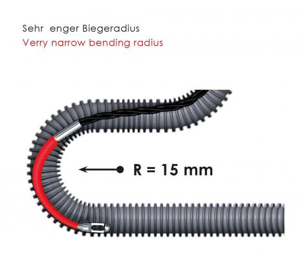 De gepatenteerde RG7 anti-torsie geleidekop Ø 5,5mm (aangedrukt aan het begin en einde van de band) maakt het mogelijk de kleinste radiussen te overwinnen (buigradius 15 mm).