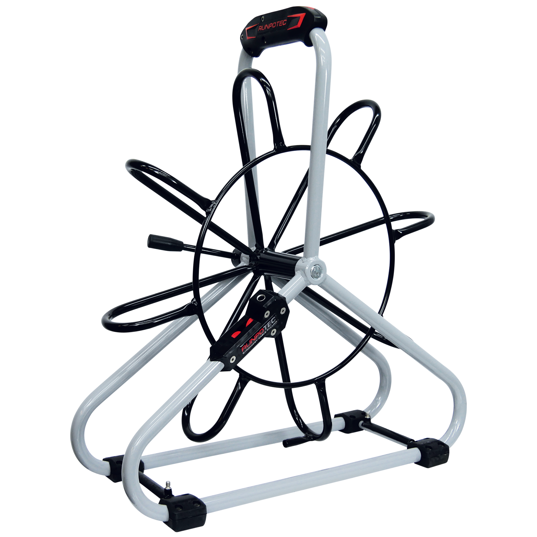 Mobiele stalen haspel van gegalvaniseerd frame gepoedercoat, met dubbel uitlaatsysteem (automatische uitlaatrem en sneluitlaat) voor glasvezelprofielen.