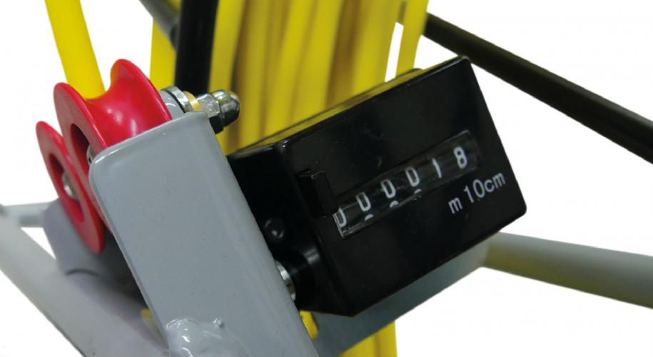 Zeer hoogwaardige 15mm trekveer in robuust gegalvaniseerde/gepoedercoate haspel 1400mm inclusief ingebouwde meterteller en extra parkeer rem.