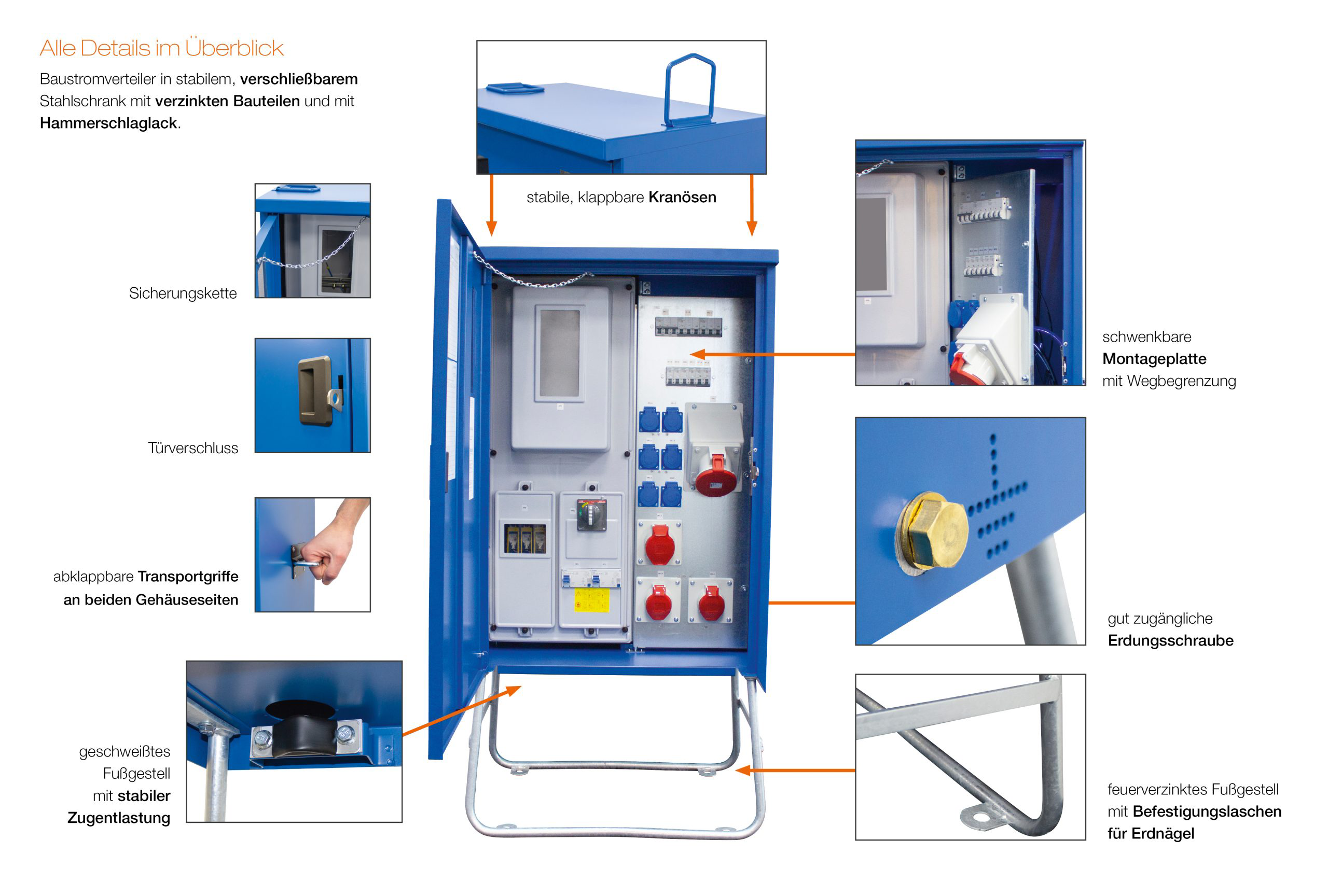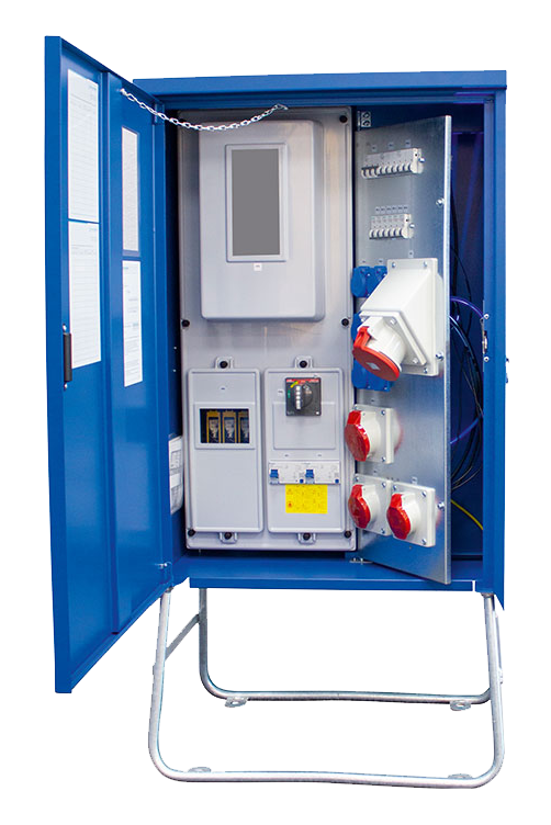 Bouwplaats-stroomverdeelkast in een robuuste stalen kast met zware metaalvrije kunststof coating in de kleur blauw