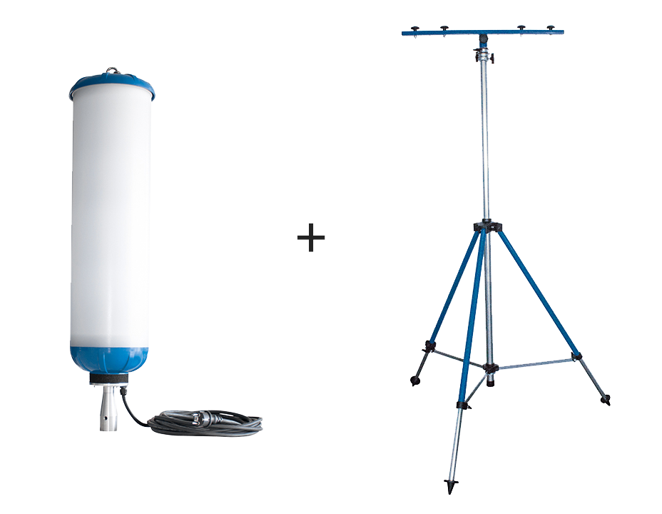 • Statief met DIN-tap en 820 mm lange dwarsbalk met DIN-houder voor het snel bevestigen en vastzetten van de werklampen op het statief