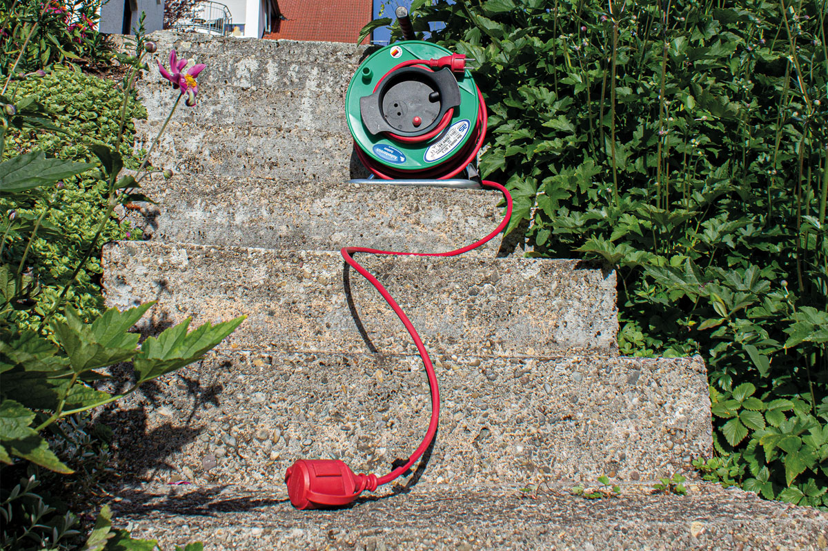U sluit de haspel met de 1,5 m lange aansluitkabel aan op het lichtnet en laat de haspel op een stabiele ondergrond staan