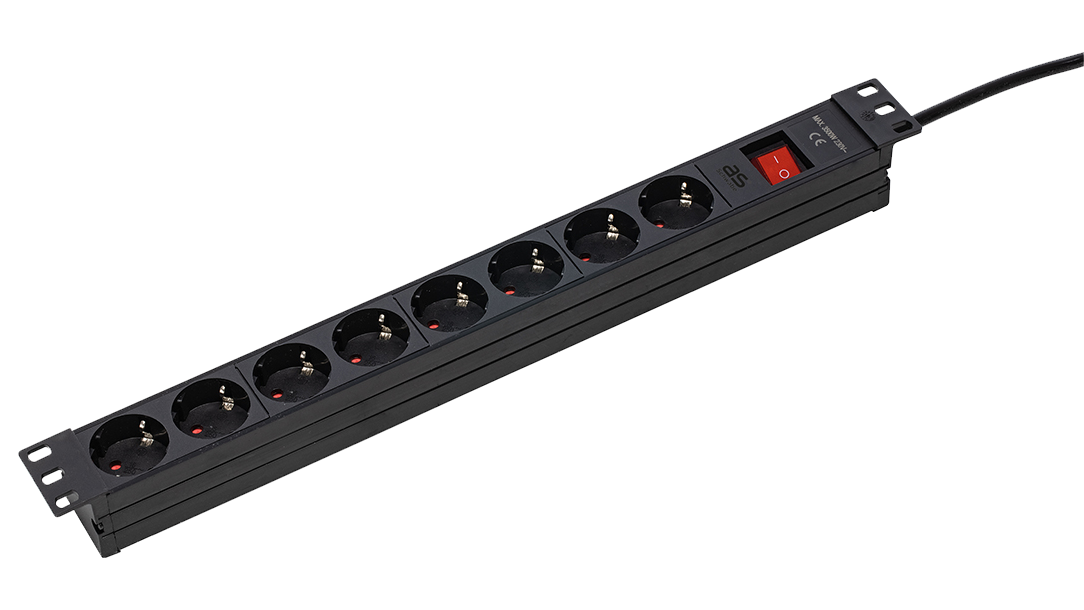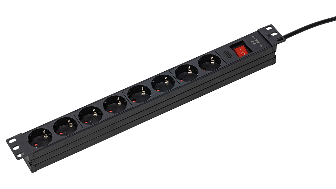 Kunststof Stekkerdoos 19" Rack 8x randaarde met schakelaar en kabel H05VV-F 3G1,5 zwart 3m