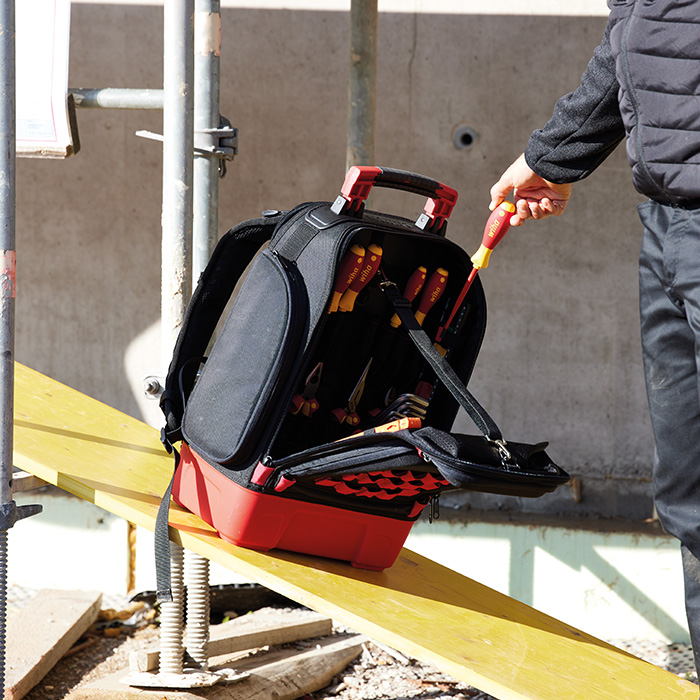 De professionele elektricien-gereedschaprugzak van Wiha is de perfecte oplossing en staat garant voor grenzeloze vrijheid met zijn beschermde design. Het geavanceerde vakkensysteem biedt een overzichtelijke organisatie en een eenvoudige verwijdering van de gereedschappen. Bij 1/3 opening van de rugzak wordt bovendien een praktische snelle toegangsmogelijkheid geboden. De in totaal 77 opberg- en 30 flexibele bevestigingsmogelijkheden maken personaliseringsopties mogelijk met verder gereedschap en toebehoren. De robuuste onderbak van de rugzak met een stabiele stand zorgt ervoor dat de rugzak in de geopende toestand veilig staat. Bovendien bewijst deze zich dankzij het resistente materiaal in natte en vuile werkomstandigheden. Verder is de gereedschaprugzak niet alleen de werkplaats voor onderweg, maar ook een mobiel kantoor. Een laptop- en kantoorvak maakt het beschermd en schoon opbergen mogelijk van laptop, mobiele telefoon en documenten, gescheiden van de gereedschappen. Voor comfortabel dragen biedt de rugzak verstelbare en ademende draagelementen en een robuuste, antislip handgreep. Aan de hoogste kwaliteitseisen voldoet hij dankzij het hoogwaardige bovenmateriaal 1680D en YKK-ritssluitingen. Voor persoonlijke og gevoelige voorwerpen biedt de rugzak verder aparte, gevoerde vakken. De rugzak bevat voor alle schroefwerkzaamheden naast de 10-delige stifsleutelset en de 14-delige bitset ook zeven ergonomische schroevendraaiers en de kleine compacte Stubby. Alle vasthoud-, toevoer- en snijtaken kunnen met de combi- en waterpomptangen en de krachtzijkniptang afgehandeld worden. De Wiha-bankwerkershamer, het meetlint en vijf ringrsteeksleutels met ratel maken het mobiele assortiment voor de vakman compleet. Bovendien is de rugzak individueel uit te breiden dankzij het universele Molle-systeem. Voor de praktische lussen zijn er op internet tal van accessoires, om de rugzak aan te vullen en uit te breiden (niet bij de levering inbegrepen). Met de professionele gereedschaprugzak en zijn mobiele uitrusting van hoogwaardige Wiha gereedschappen heeft u altijd overal alles bij u!